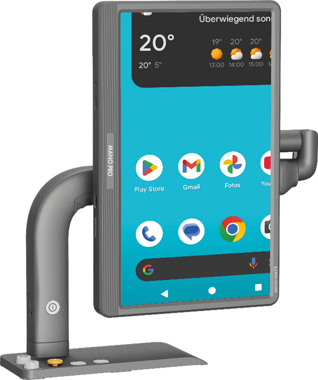 Transportables Bildschirmlesegerät der Firma Reinecker (17,3″) mit drei Kameras für Nah-, Fern- und Raumsicht. Touch-Bedienung, anpassbare Darstellung und OCR mit Vorlesefunktion. Unterstützt Gerätespiegelung von Smartphones und Akku-Betrieb.